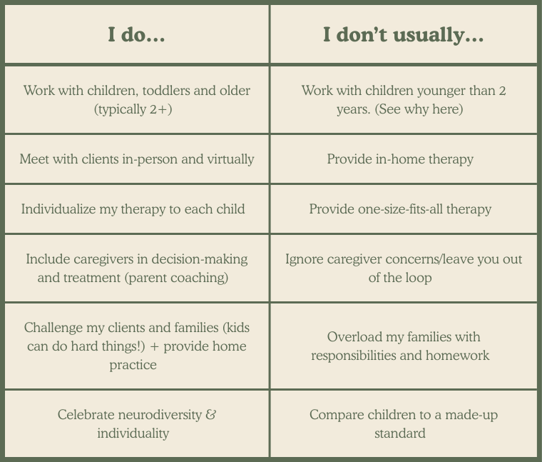 When choosing a speech therapist for your child, please don’t settle for the latter. The right fit is definitely out there. I’d love to tell you a little bit about my values and the way I approach therapy so that you can see if I am the right speech therapist for your child.